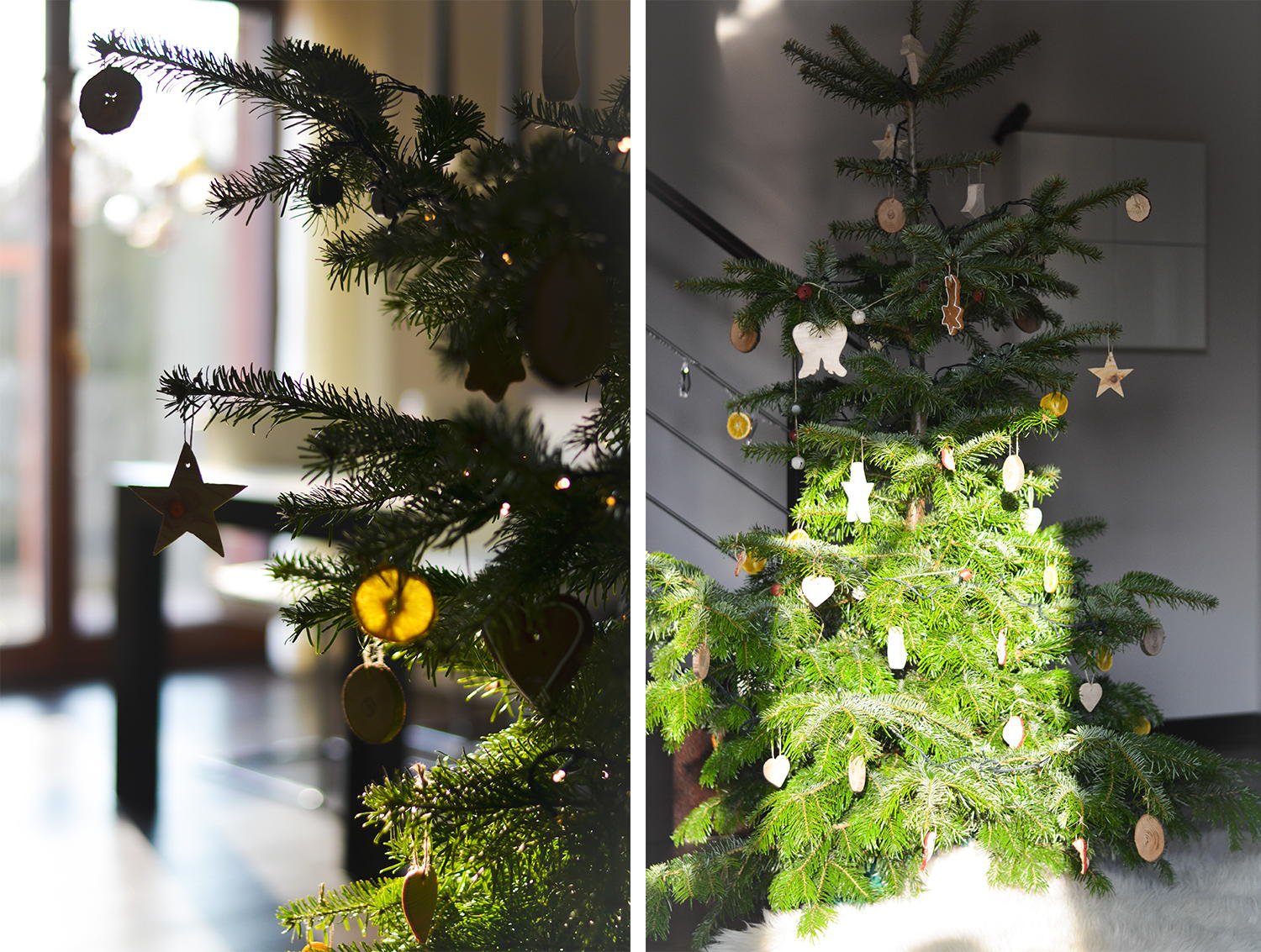 Dlaczego drewno? Z wielu powodów. Po pierwsze to surowe ładnie wygląda, zwłaszcza powieszone na naturalnej choince. Po drugie takie ozdoby są bezpieczne, nie tłuką się, co przy dziecku, które jeszcze nie do końca odpowiada za własne czyny, na pewno ułatwia sprawę. Po trzecie: są uniwersalne – pasują do wszystkiego. No i trwałe – można ich używać przez wiele, wiele lat. Przecież drewno tak pięknie się starzeje!