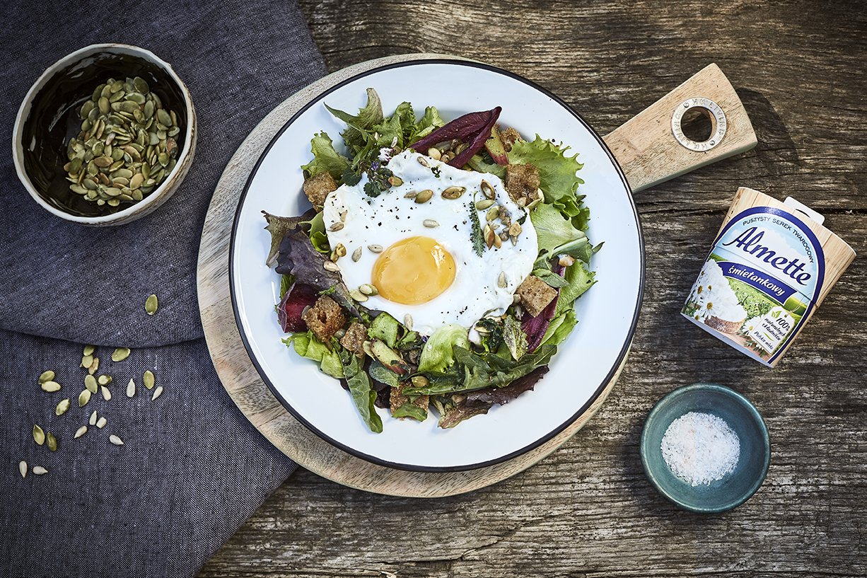 Liście dzikich ziół i roślin dobrze umyj i osusz. Liście pokrzyw sparz wrzątkiem i od razy zahartuj w lodowatej wodzie, również osusz. Następnie w miseczce wymieszaj serek Almette śmietankowy z wodą jak na dressing, dodaj oliwę, sok z cytryny, sól i pieprz do smaku. Wymieszaj. Sałatkę posyp pestkami słonecznika i polej dressingiem oraz serwuj z sadzonymi jajkami, jajkami na miękko lub w koszulce.