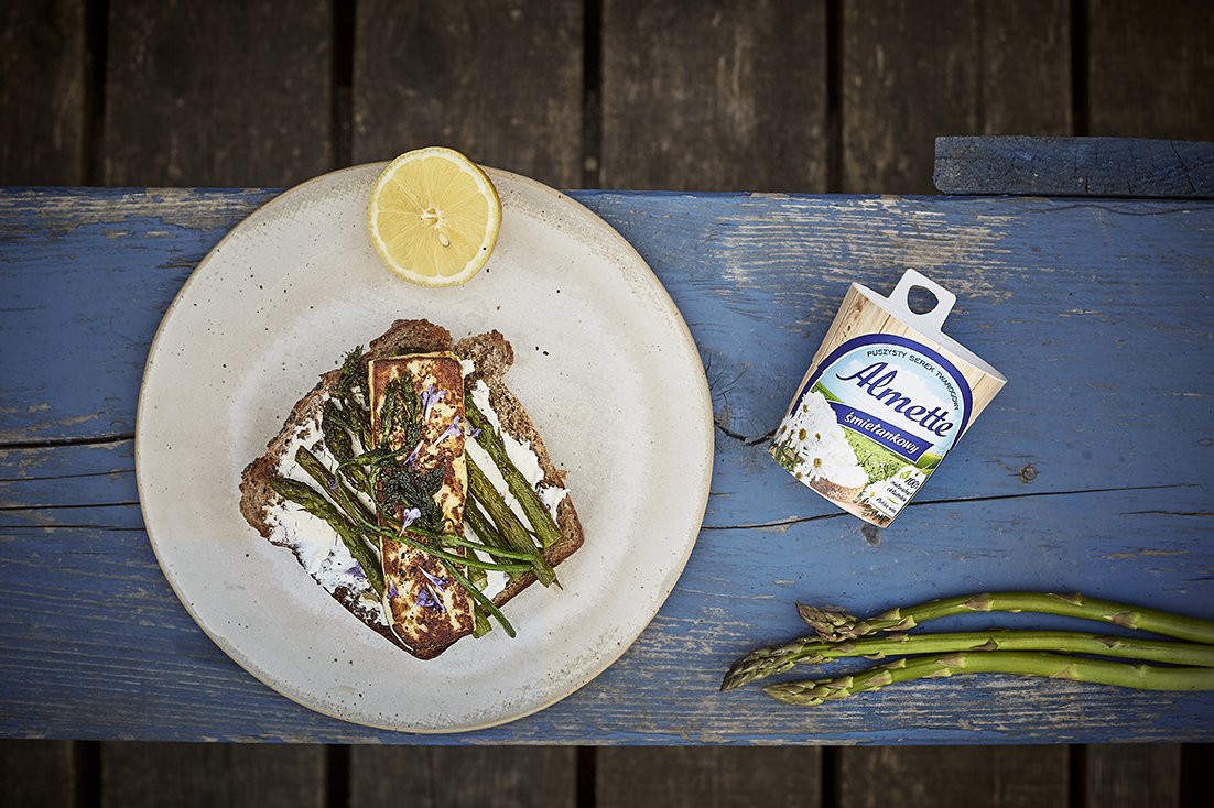 Na patelni na oliwie podsmaż plastry sera halloumi na złoty kolor z dwóch stron. Młode pędy zblanszuj lub też od razu usmaż na patelni na maśle klarownym, dopraw solą i pieprzem. Zgrilluj kromki chleba i posmaruj je serkiem Almette śmietankowym. Ułóż na nich plastry sera halloumi, młode pędy chmielu, a na koniec udekoruj ulubionymi ziołami.