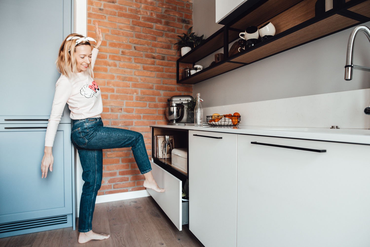 Wydawało mi się, że to pomysł genialny i faktycznie, normalny korytarz zamiast małej klitki jest wygodny, ALE nie przewidziałam jednego. Że dzieci nie będą za każdym razem po powrocie z dworu chować swoich butów i kurtek do szafy. W efekcie – choć nie widzę garów w kuchni, to widzę porozrzucane w korytarzu bambolety. Czapki. Szale. Rękawiczki.