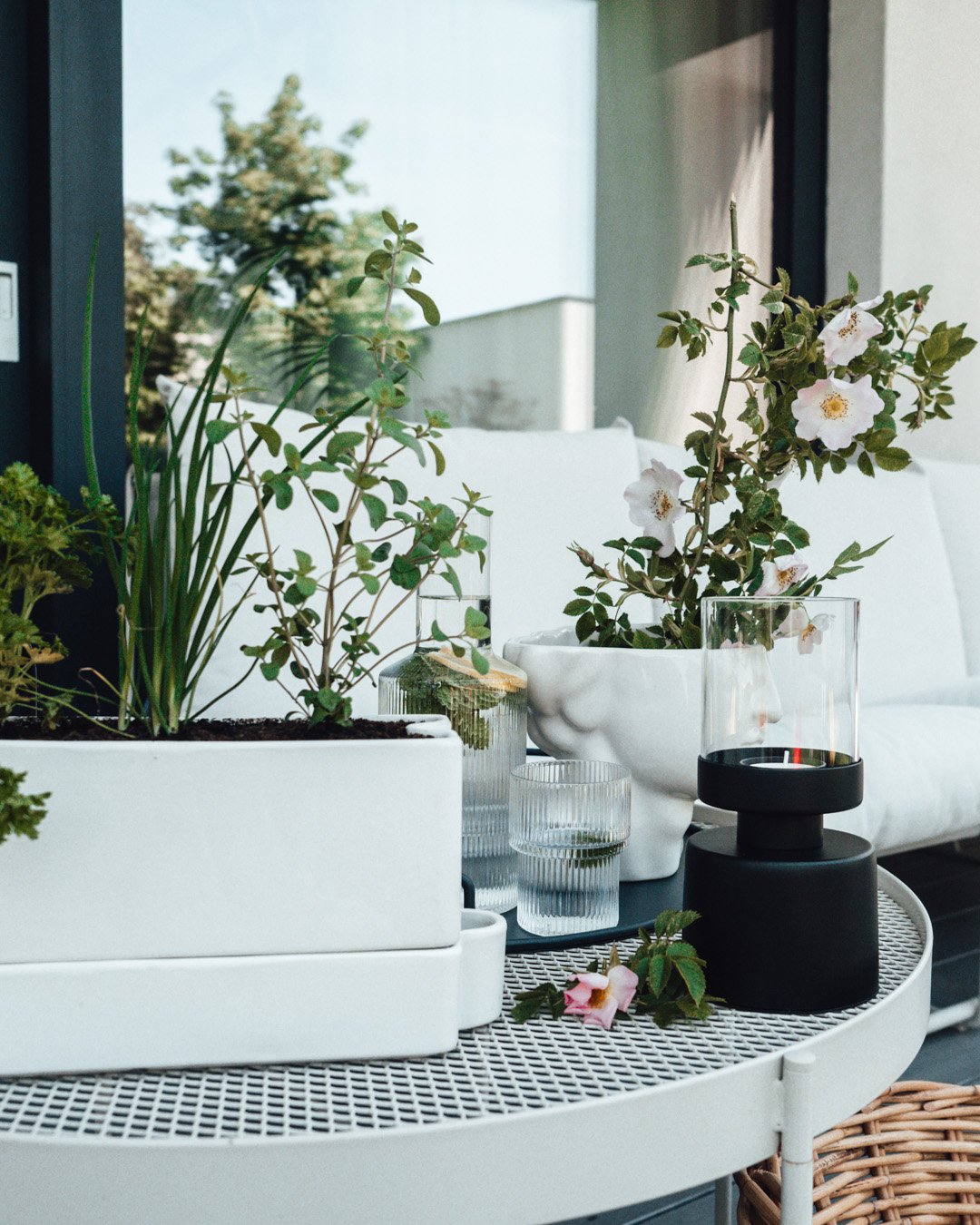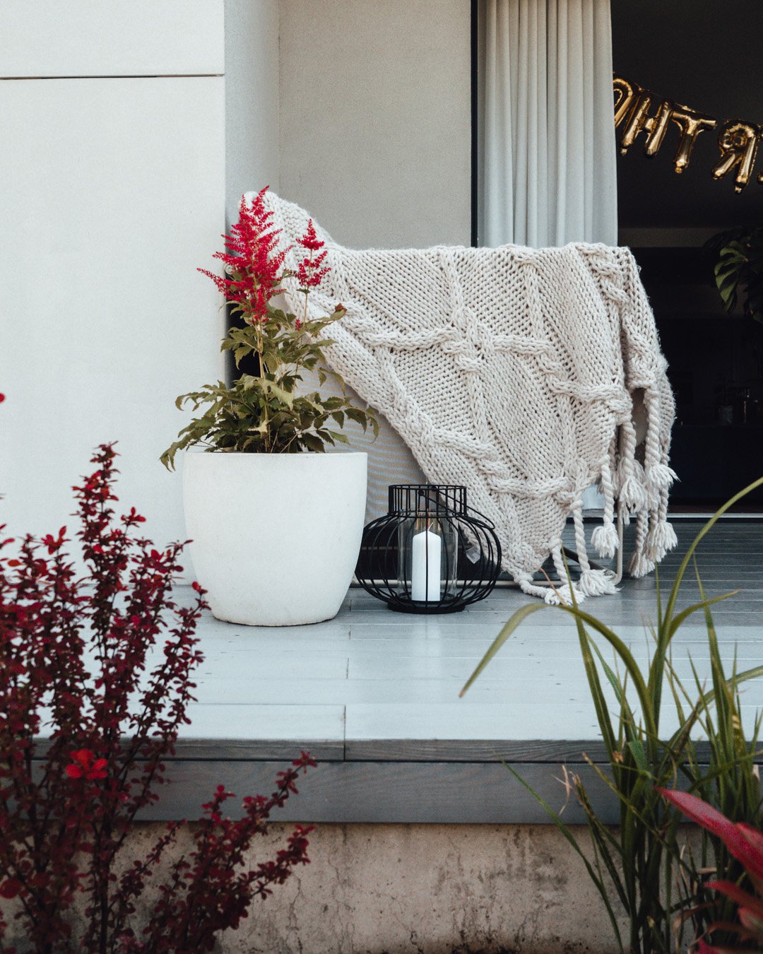 kanapy – IKEA HAVSTEN | stoliki – IKEA | duże białe donice – sklep ogrodniczy na Zawadach (Poznań) | wszystkie czarne lampiony – H&M Home | samopodlewająca się doniczka na zioła – IKEA | wiklinowy kosz na koce – IKEA | granatowa taca – H&M Home | wazon/doniczka w kształcie twarzy – H&M Home | prążkowane szklanki i karafka – Ferm Living Ripple | kolorowe filiżanki z tacą – H&M Home | konewka – Jysk | wełniany koc – H&M Home | głośnik – Marshall Stanmore