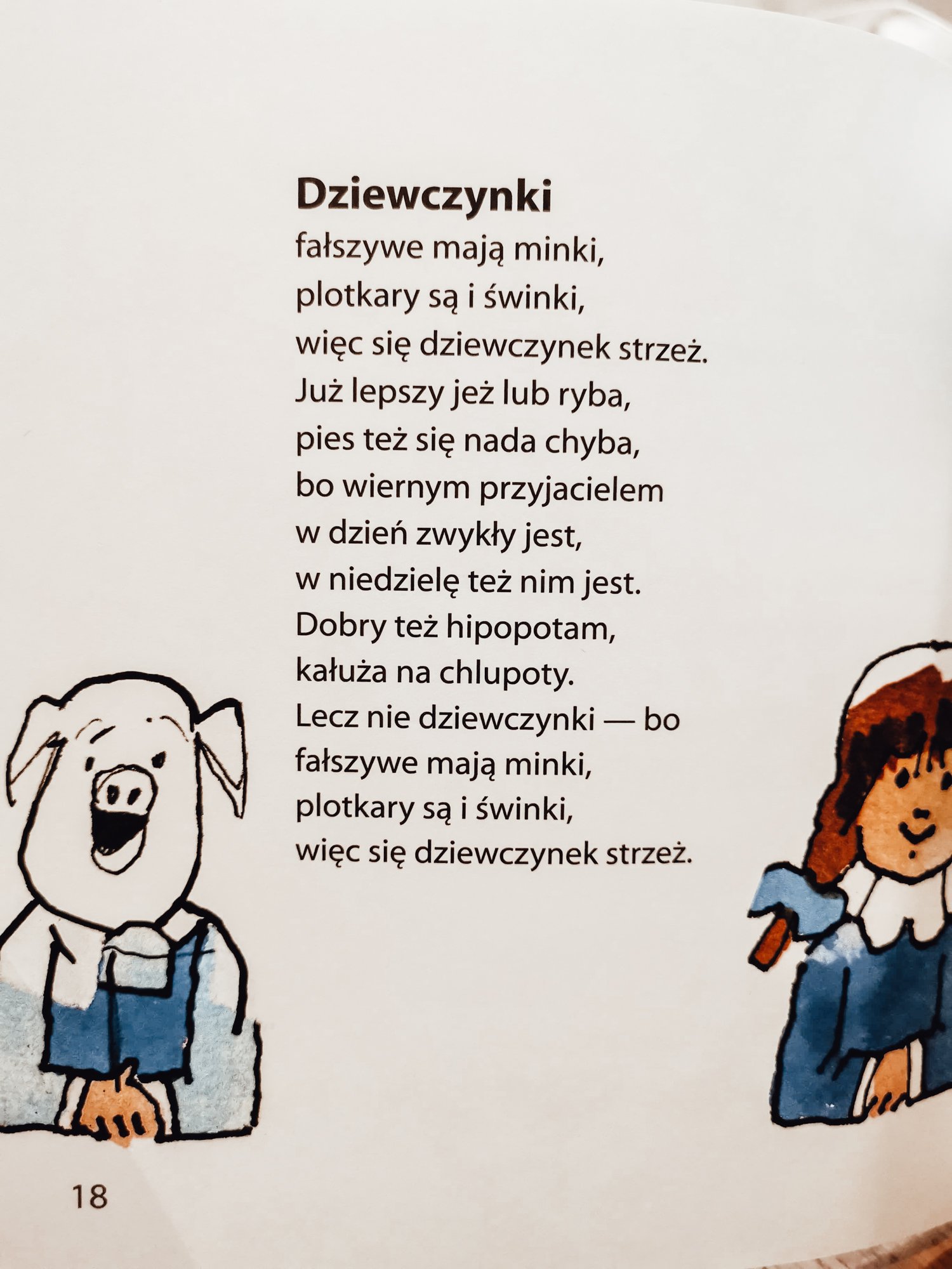 Wyobraź sobie, że kupujesz dziecku w księgarni książkę z wierszykami. Wieczorem zasiadacie do czytania, przeglądając razem spis treści, a dziecko wybiera wierszyk o dziewczynkach. Niczego nieświadoma otwierasz książkę na osiemnastej stronie i zaczynasz głośno recytować: „Dziewczynki. Fałszywe mają minki, plotkary są i świnki, więc się dziewczynek strzeż”.