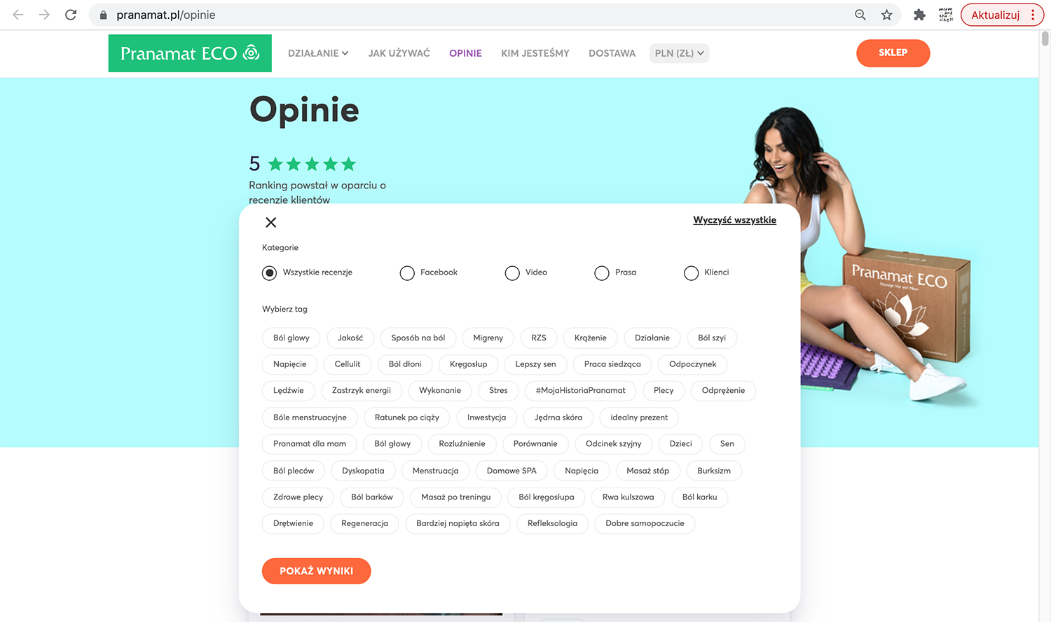 Jeśli nie jesteś jeszcze pewna, możesz przeczytać, jakie opinie ma ta mata do akupresury. Bardzo polecam sprawdzić tę stronę przed zakupem, bo są to recenzje realnych użytkowników. A najlepsze jest to, że można wybrać konkretną dolegliwość i dowiedzieć się, czy zestaw faktycznie na nią pomaga według osób, które mają Pranamat ECO w domu, a nie tylko według producenta.