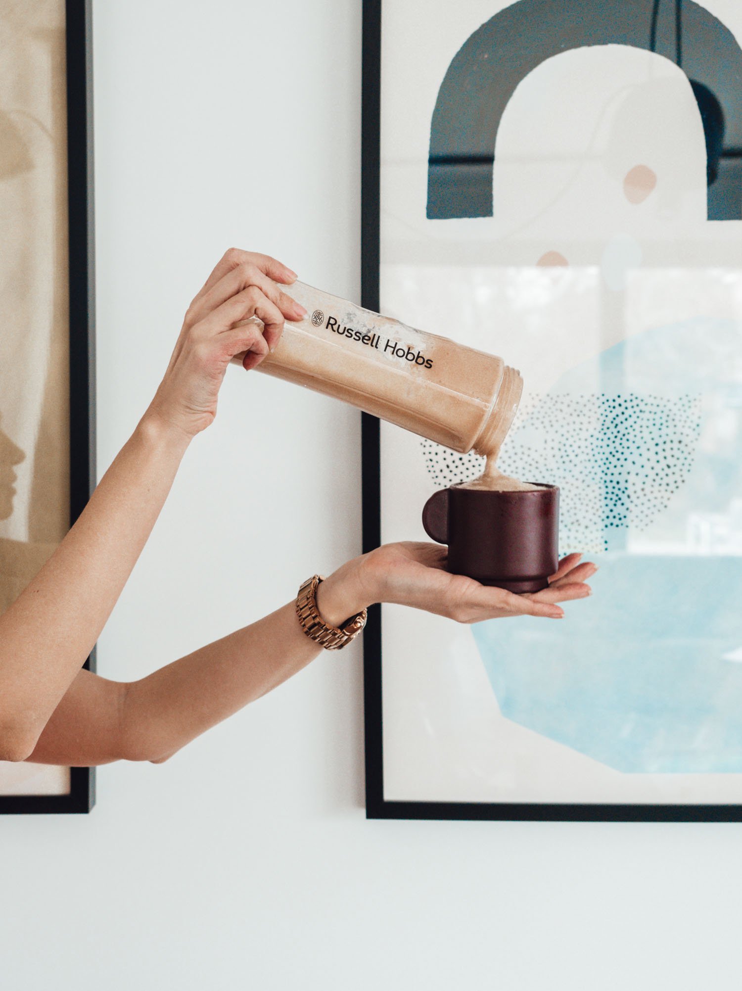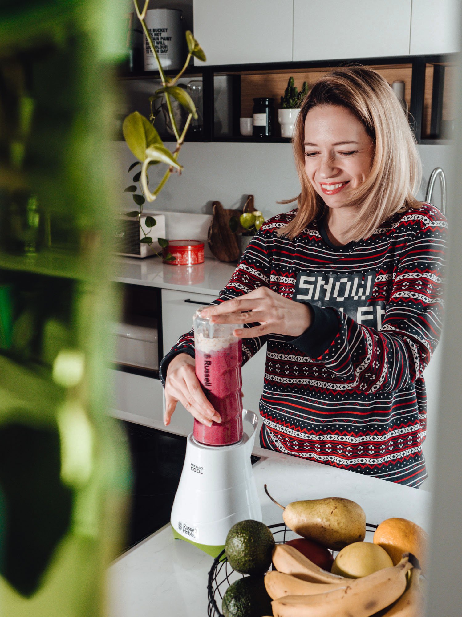 Koktajle najlepiej miksować w blenderze kielichowym. Ja przygotowuję je w specjalnym blenderze marki Russell Hobbs, który jest teraz dostępny w tak świetnej cenie w Outlecie Limango, że naprawdę warto się nim zainteresować. Podejrzysz go TUTAJ.  To mega wygoda, bo wrzucam składniki do butelki, zamykam, blenduję i potem z tą butelką od razu mogę biec przed siebie! Do blendera dołączone są dwie butelki o pojemności 600 ml, które są szczelnie zamykane i pasują do uchwytów w samochodzie. Ostrza mojego blendera bez problemu kruszą lód, mrożone owoce, suszone daktyle, figi, a części można włożyć do zmywarki!